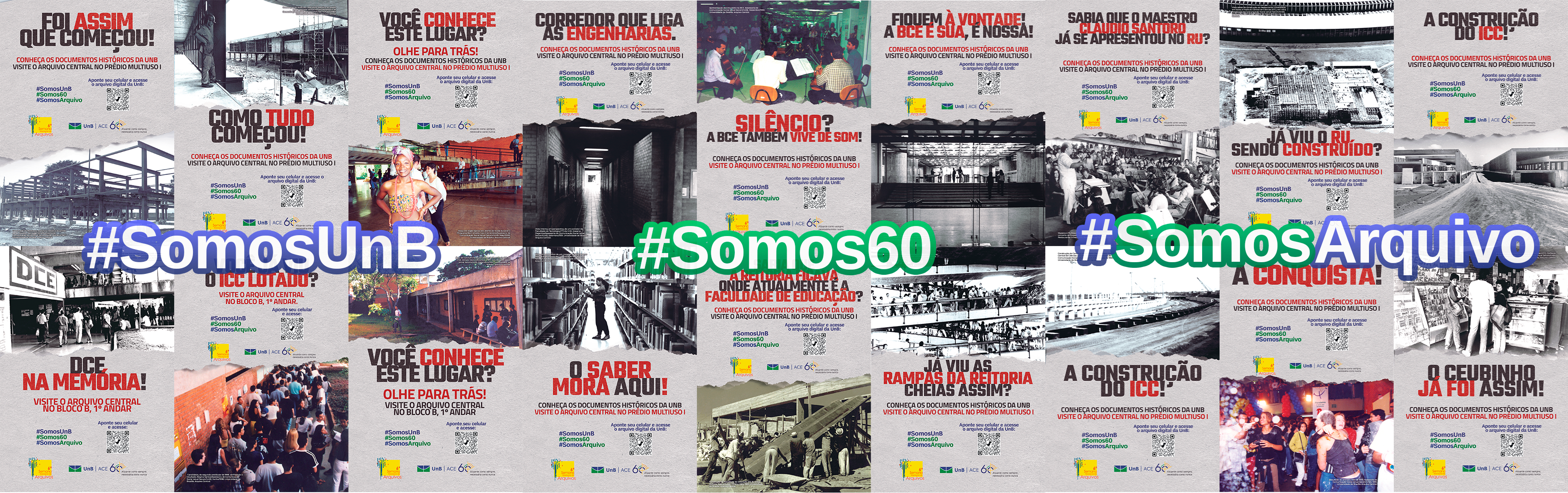 Para esta 6ª Semana Nacional de Arquivos (2022), o Arquivo Central (ACE) da Universidade de Brasília (UnB) realiza uma mostra com fotografias de seu acervo histórico por meio de pôsteres espalhados pelo Campus Darcy Ribeiro. Essas artes destacam locais da Universidade em diversos momentos desses 60 anos da UnB. Vocês encontrarão pôsteres ao longo do Instituto Central de Ciências (ICC); na Reitoria; na Faculdade de Tecnologia (FT); na Faculdade de Educação (FE); no prédio Multiuso I, onde o ACE está localizado; e na Biblioteca Central (BCE), onde encontra-se a exposição de todos esses pôsteres.