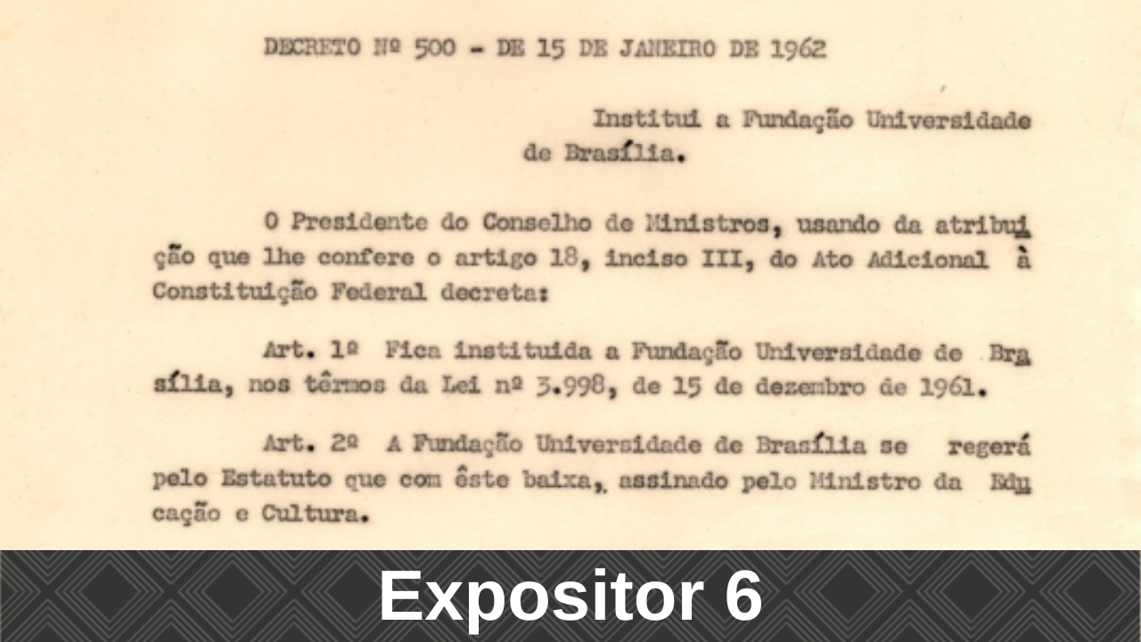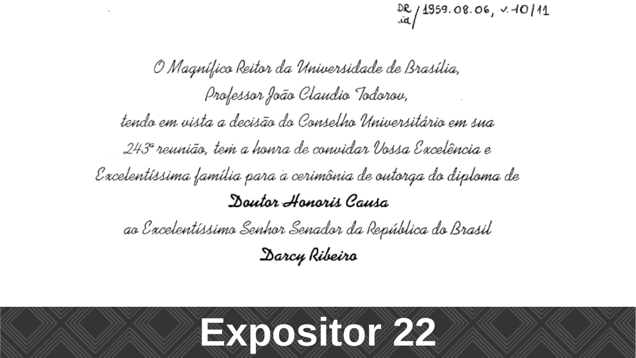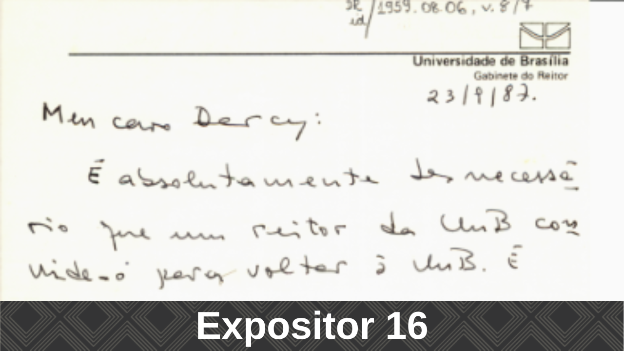 O Arquivo Central, com o apoio da Diretoria de Difusão Cultural da Universidade de Brasília (DDC/DEX), em comemoração aos 60 anos da UnB e ao centenário de Darcy Ribeiro, realizou durante a Semana Universitária a Exposição: Vivências de Darcy Ribeiro na Universidade de Brasília, no Memorial Darcy Ribeiro (Beijódromo).