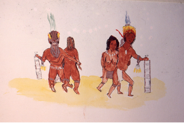 Descrição: desenhos feitos por Unúsin Panlon Kumu (Luis Lana) e Tolamãn Kenhíri (Feliciano Lana), indígenas desânas. Os desenhos figuram as lendas míticas do povo acerca da criação do mundo que originou o livro “Antes o Mundo não Existia”.