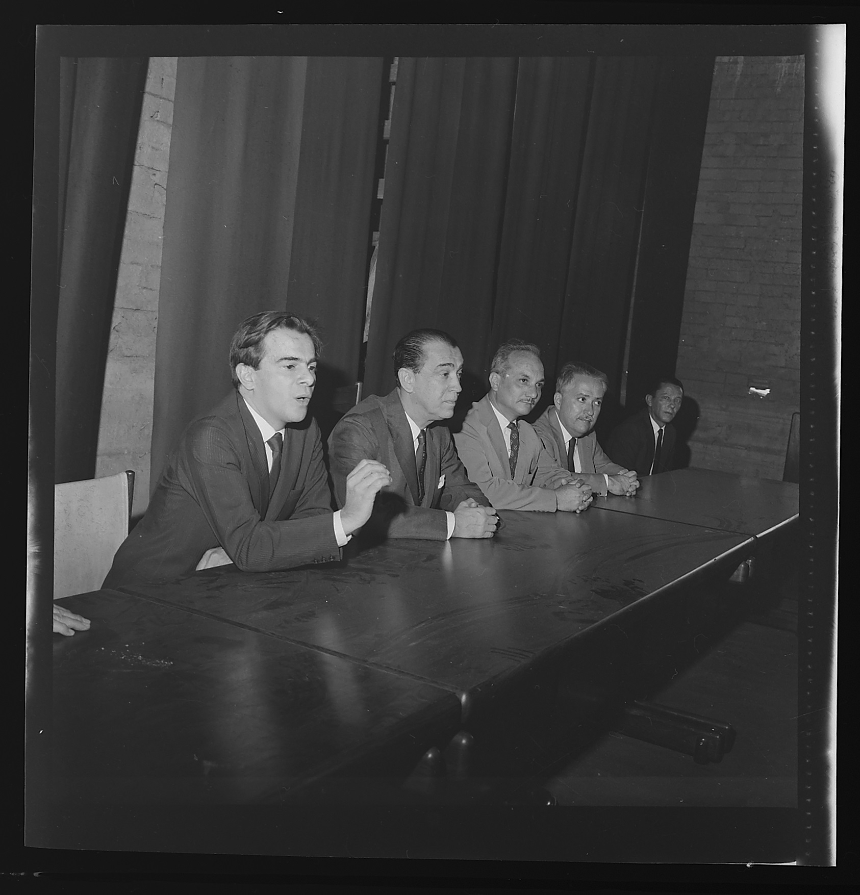Darcy Ribeiro e o Presidente Juscelino Kubitschek ainda em tratativas sobre a criação da Universidade de Brasília. Darcy Ribeiro discursando. Juscelino à mesa.