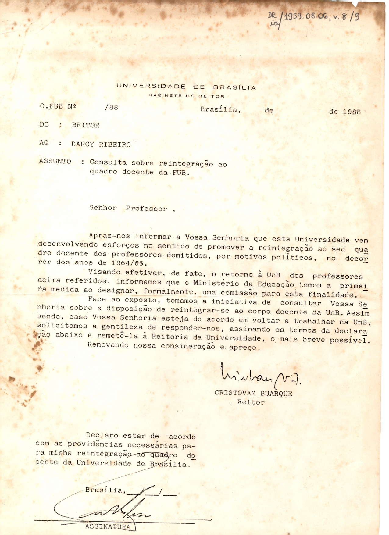 Termo de reintegração do Professor Darcy Ribeiro a UnB.