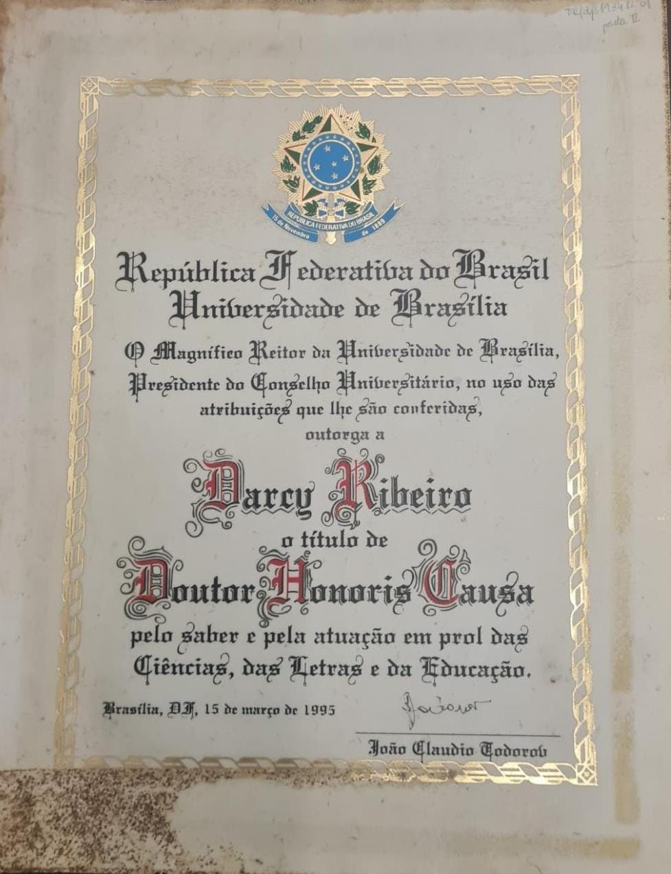 Documento do Honoris Causa conferido a Darcy Ribeiro pela Universidade de Brasília.