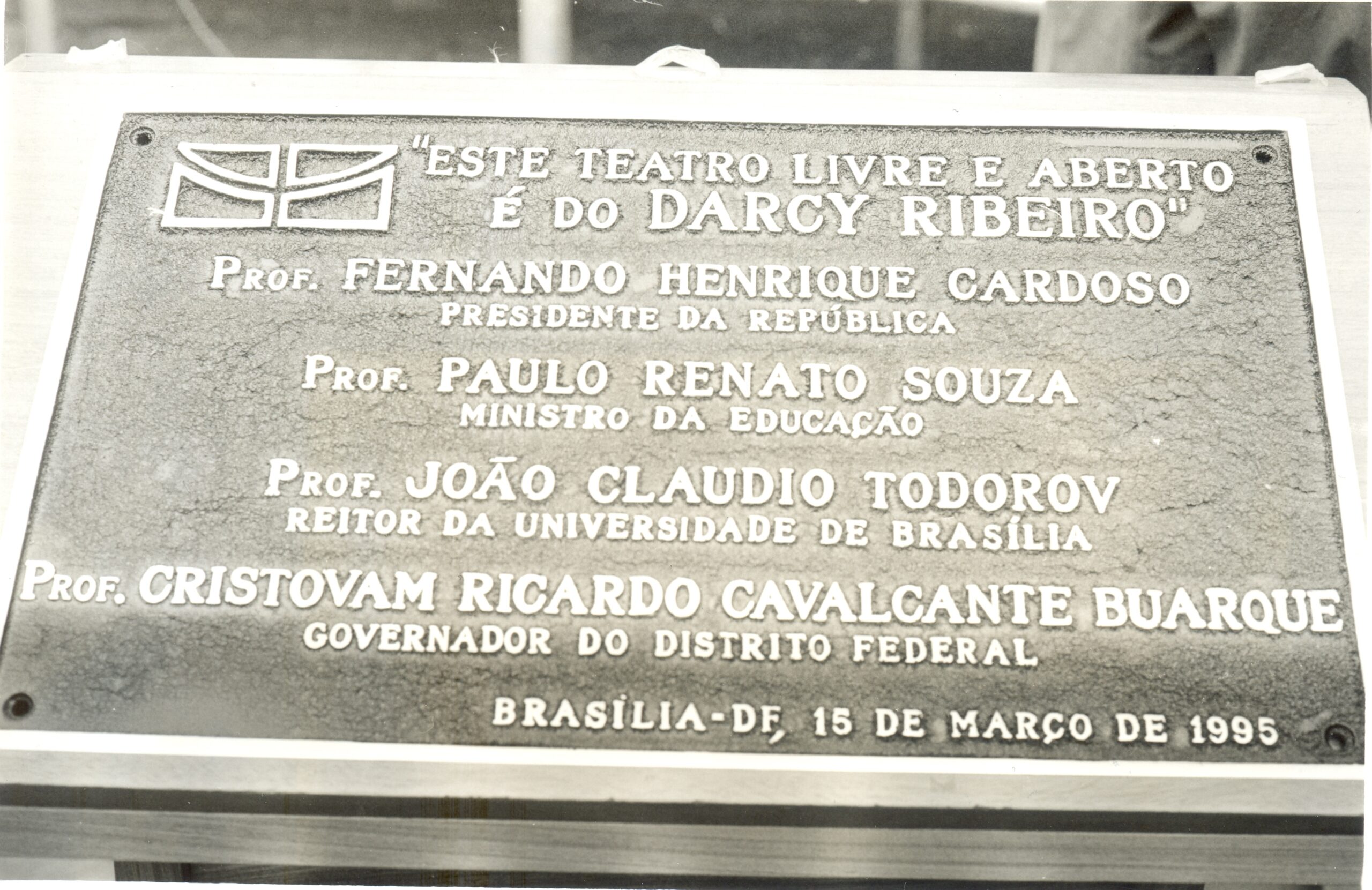 Placa que dá o nome Darcy Ribeiro ao Campus Universitário. Placa de metal com os escritos: “Este teatro livre e aberto é do Darcy Ribeiro”.
